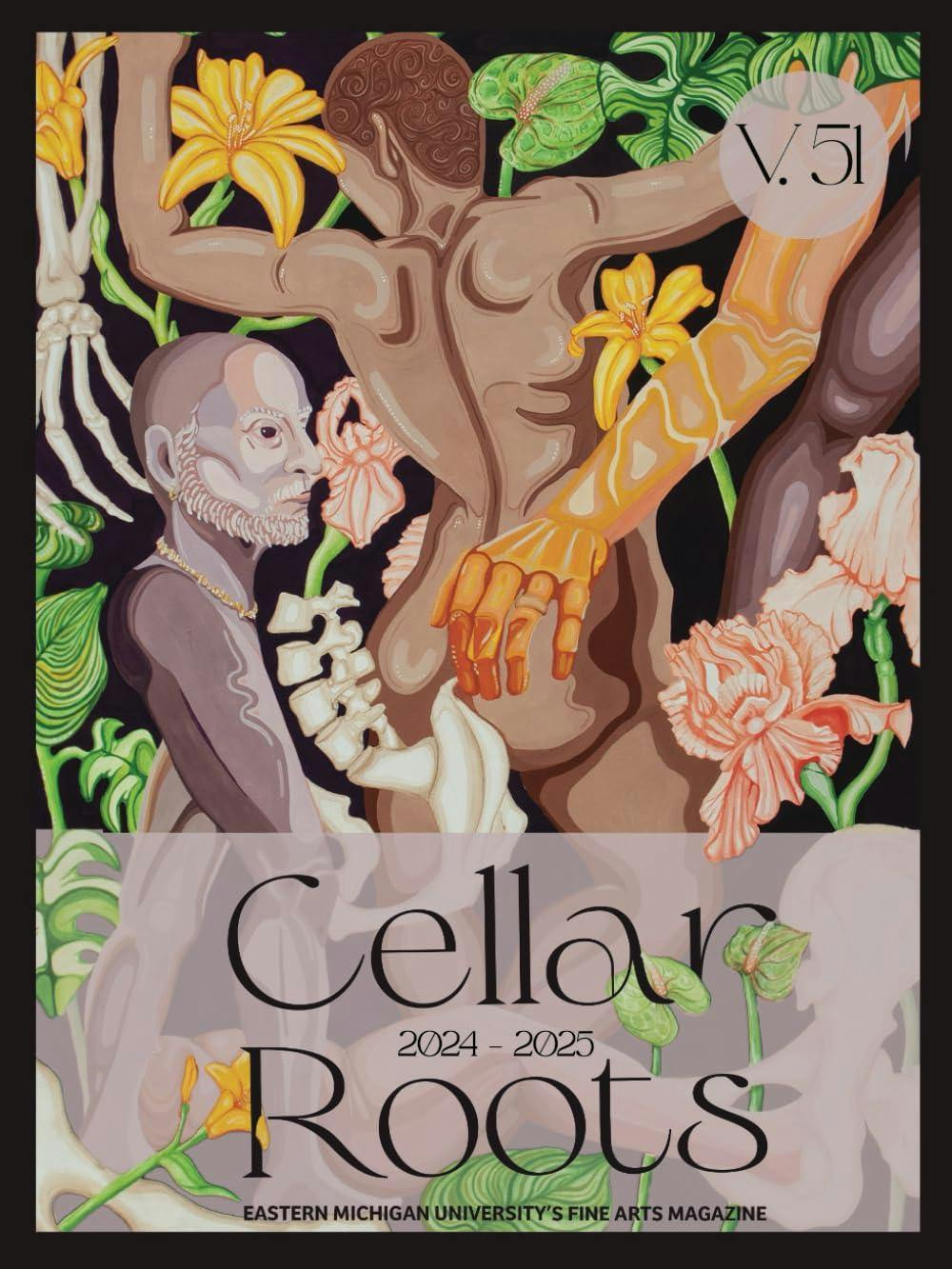 The year 2025 brought to fruition the 51st volume of Cellar Roots, EMU's student-operated fine arts and literary magazine. A huge shoutout to the staff that made this volume possible: Editor-in-Chief Madison Cantrell, Graphic Design Lead Laurence Bourdeau and Graphic Designer Ashley Schemer!