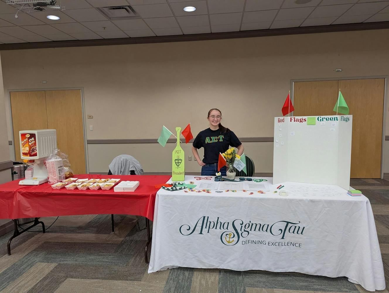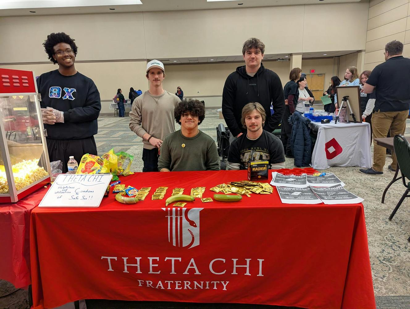 Greek life was represented at Sexapalooza by Alpha Sigma Tau and Theta Chi. Members of Alpha Sigma Tau talked about red and green flags in partners and handed out nachos, while Theta Chi discussed safe sex and offered condoms and popcorn to passersby.