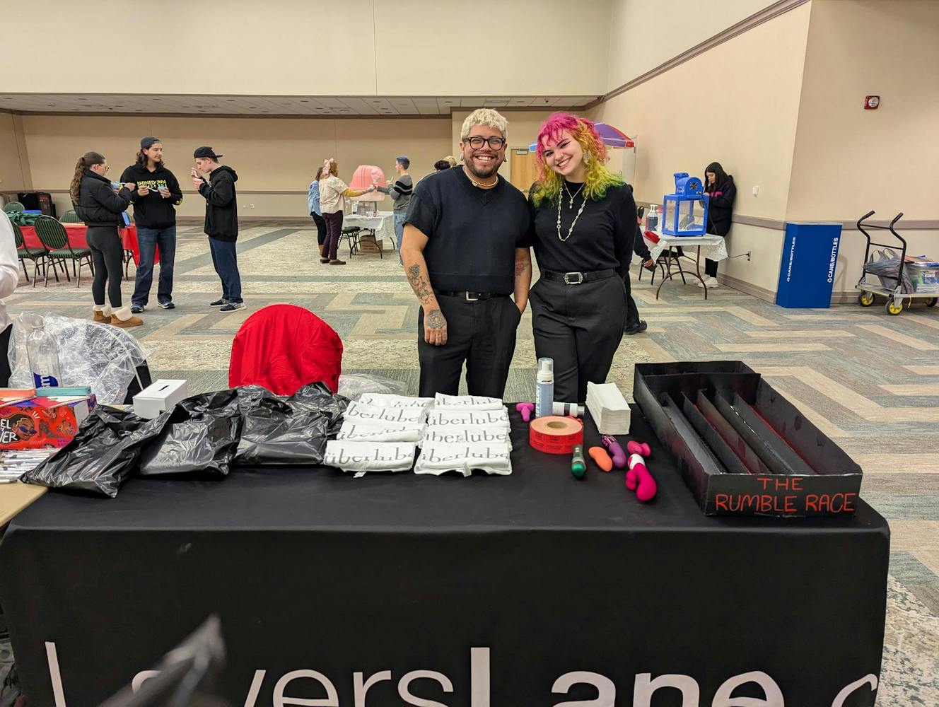 This lightheartedness was evident as students walked through the door. The first table in the room was filled with free items for students, a vibrator rumble race, and dildo ring toss. Lover’s Lane, an adult sex and lingerie shop located in Ypsilanti, hosted these games and encouraged students to have open conversations about sex toys and desires.