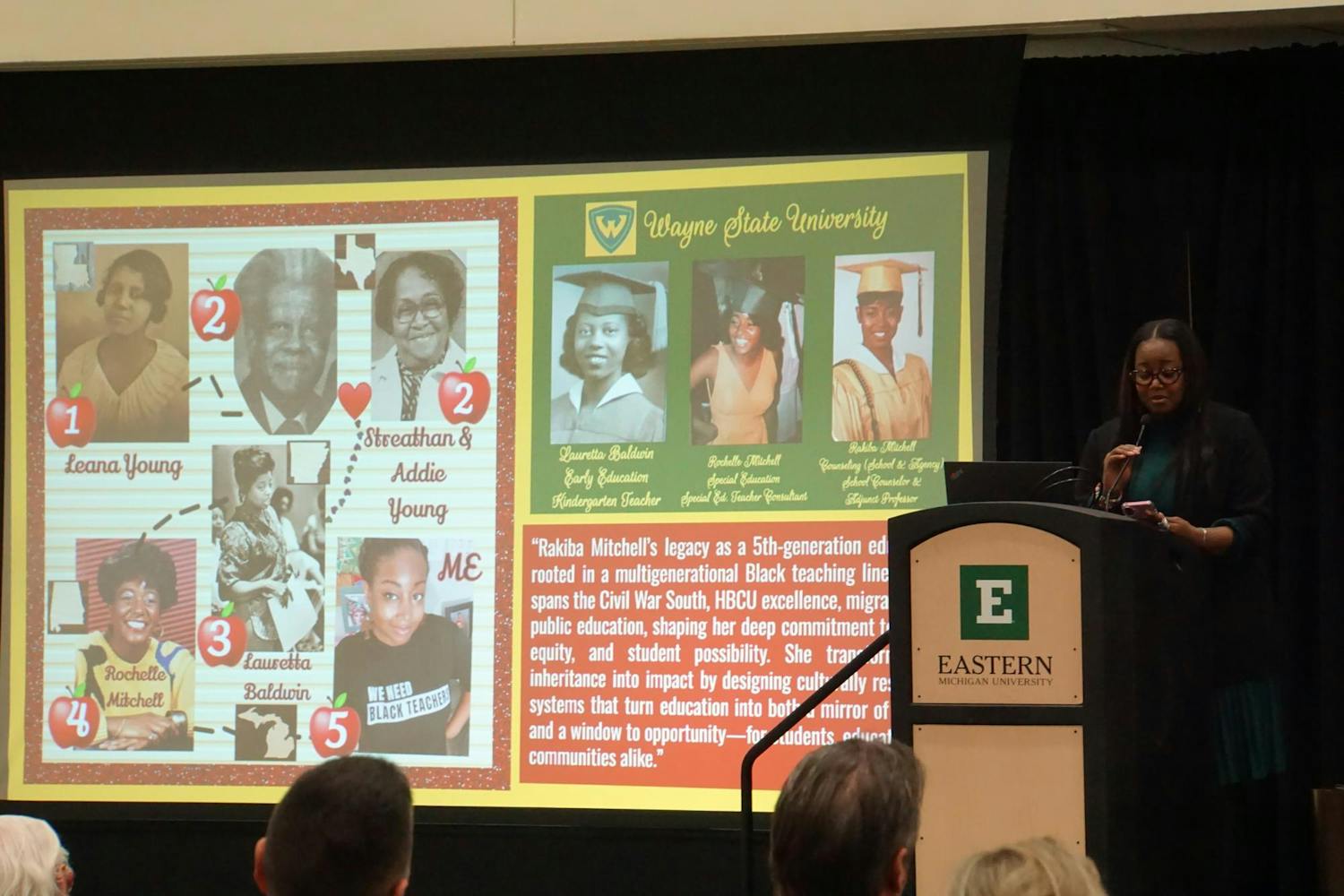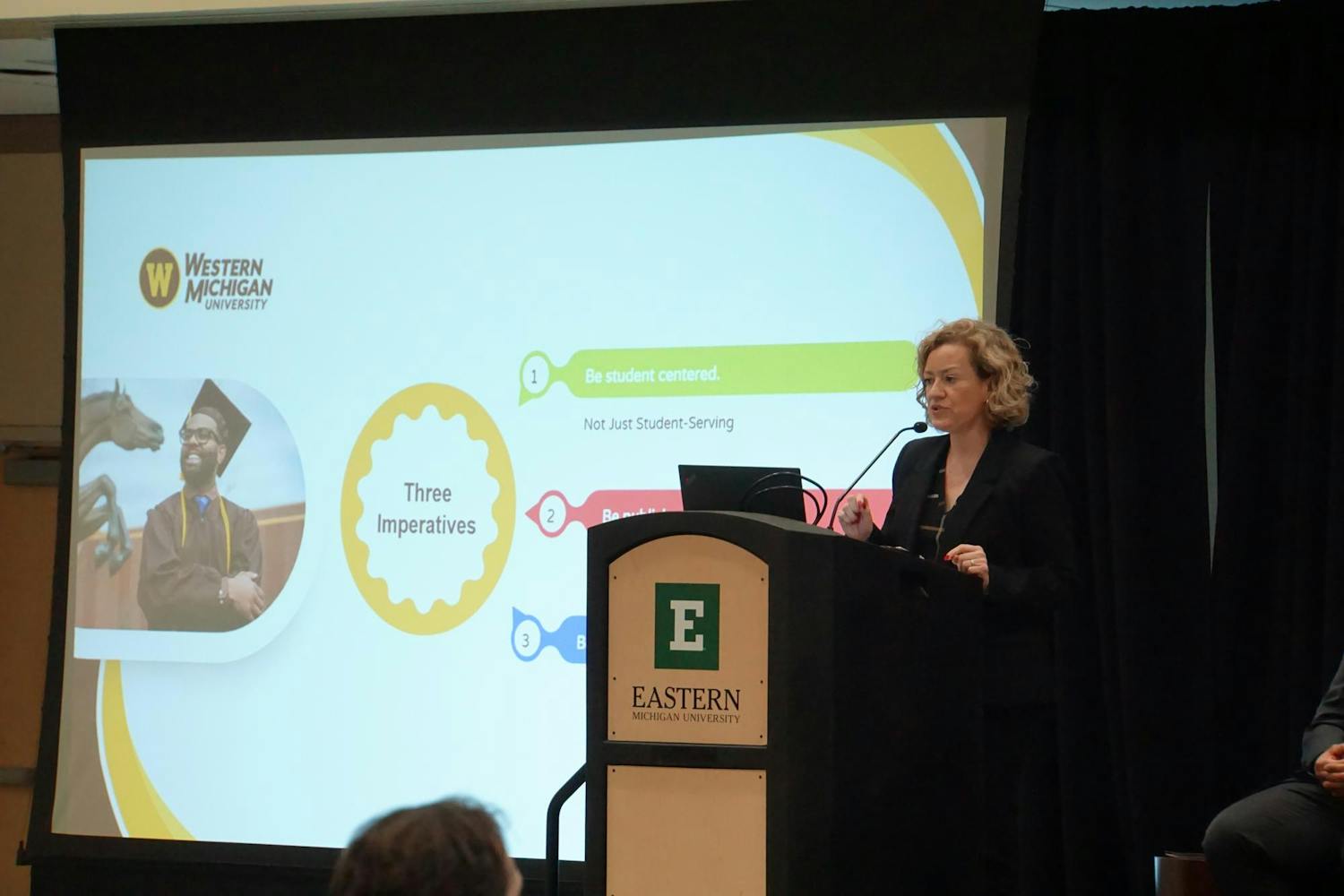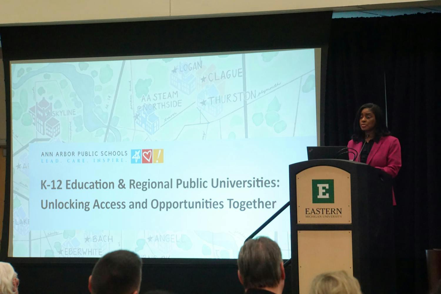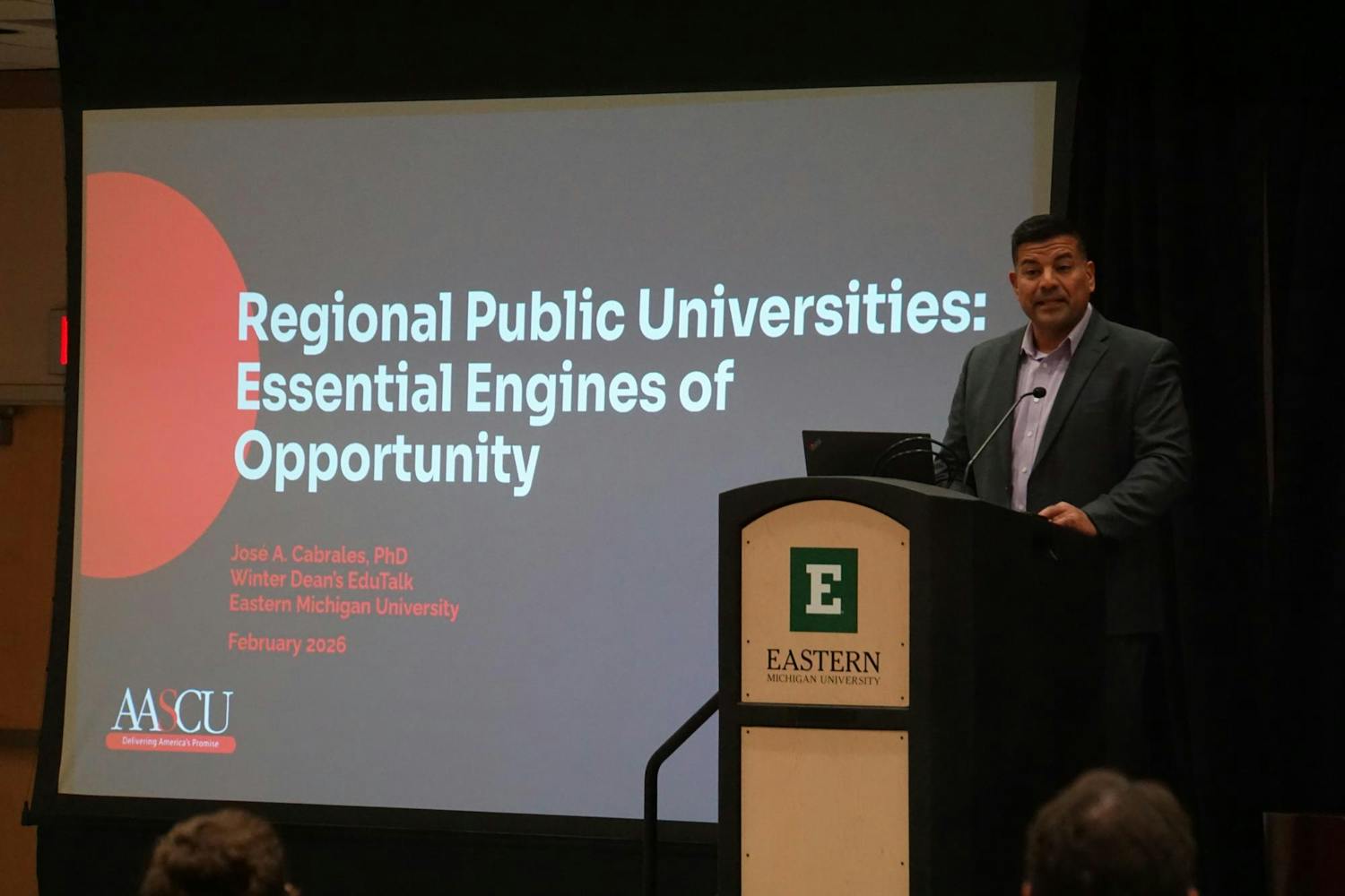 The Dean's EduTalk featured multiple speakers with experience in education to speak about the role public universities play in the community and how they can improve positive ratings from students. Many of the speakers were from other universities, except for Dr. Aesha Mustafa, who is an Assistant Professor at EMU, and Jazz Parks, who is the Superintendent of Ann Arbor Public Schools. The event took place in the Student Center Ballroom on Tuesday, Feb. 24, 2026. (Gallery by Owen Cardenas)