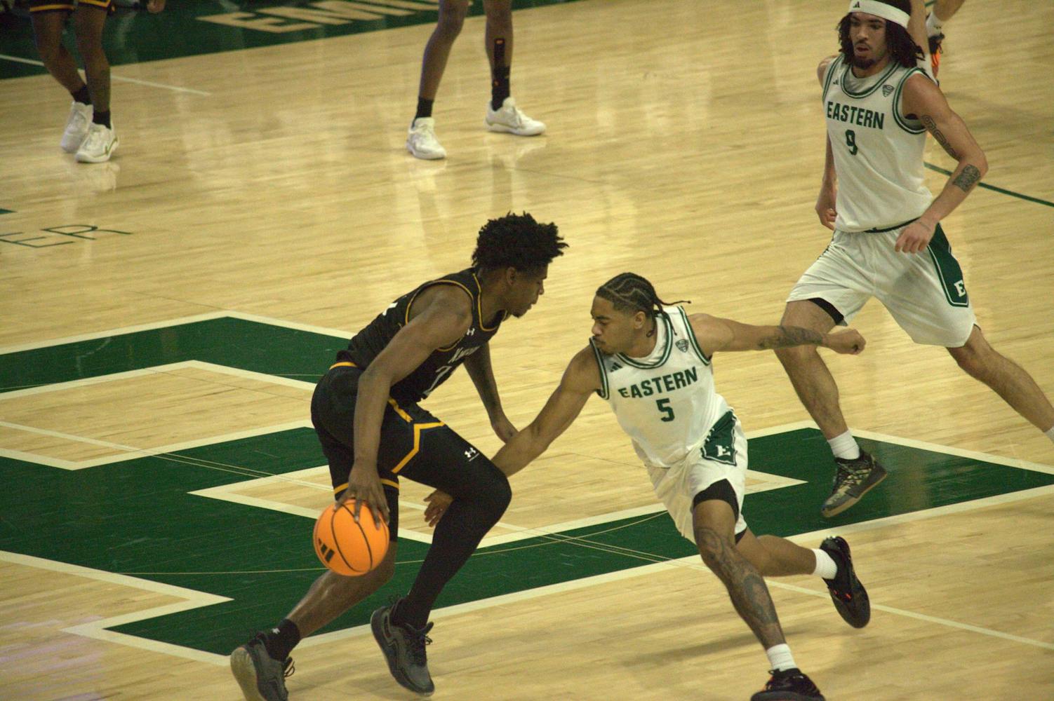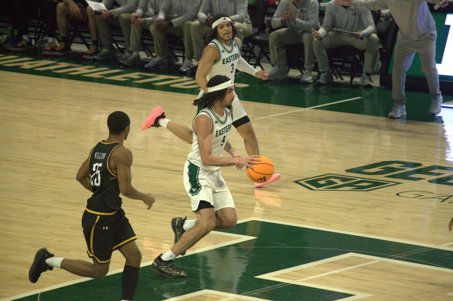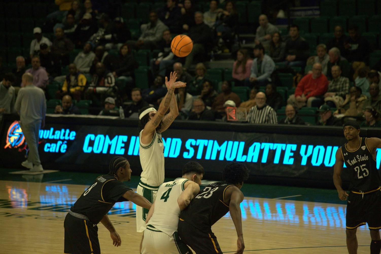 Eastern Michigan University's men's basketball lost in double overtime 76-75 against Kent State University in a neck and neck game on Jan. 24, 2026 at the George Gervin GameAbove Center. (Gallery by Bradan Copeland and Maddy Makin)