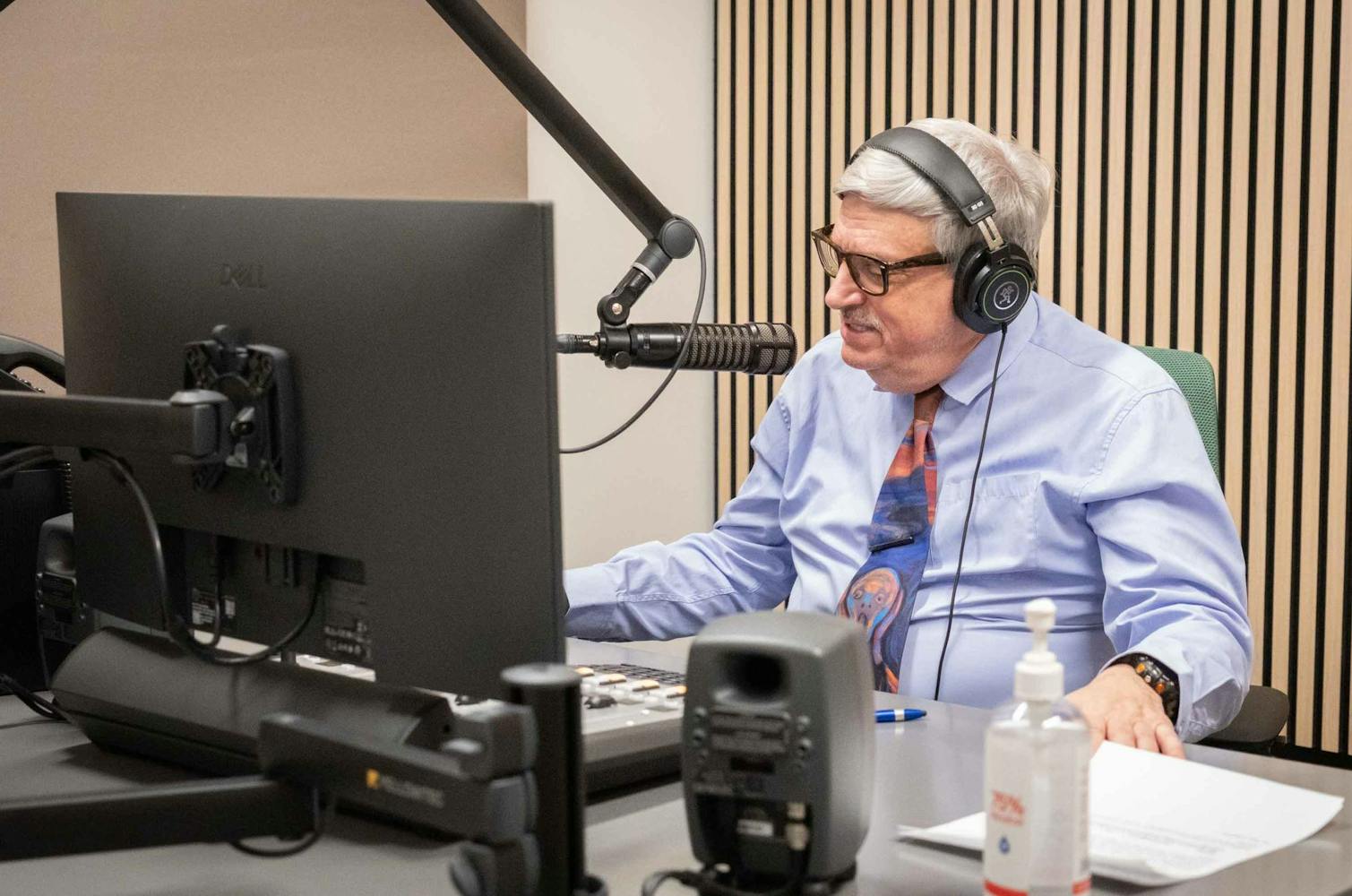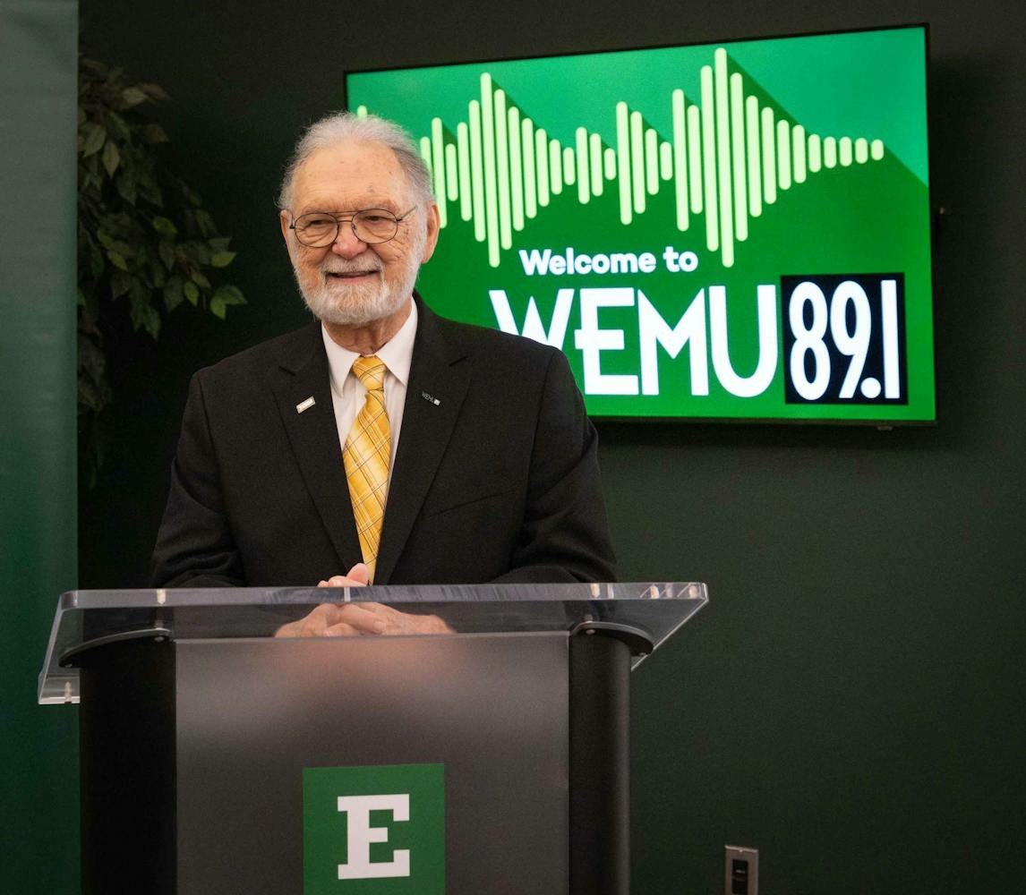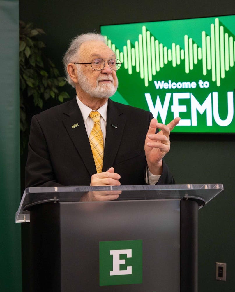 On Feb. 12, 2026, WEMU, Eastern Michigan University's National Public Radio jazz and blues radio station, celebrated its relocation from King Hall to Halle Library with a ribbon-cutting ceremony. WEMU staff and Eastern Michigan University President James Smith cut the ribbon in front of WEMU's new office, located on the ground floor of the Halle Library across from the computer lab. Smith said the change comes as a much-needed upgrade, with all new improvements to the individual office spaces, physical media library and equipment. (Gallery by Courtney Prielipp)
