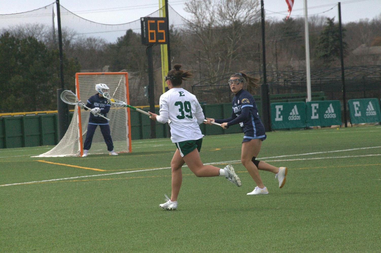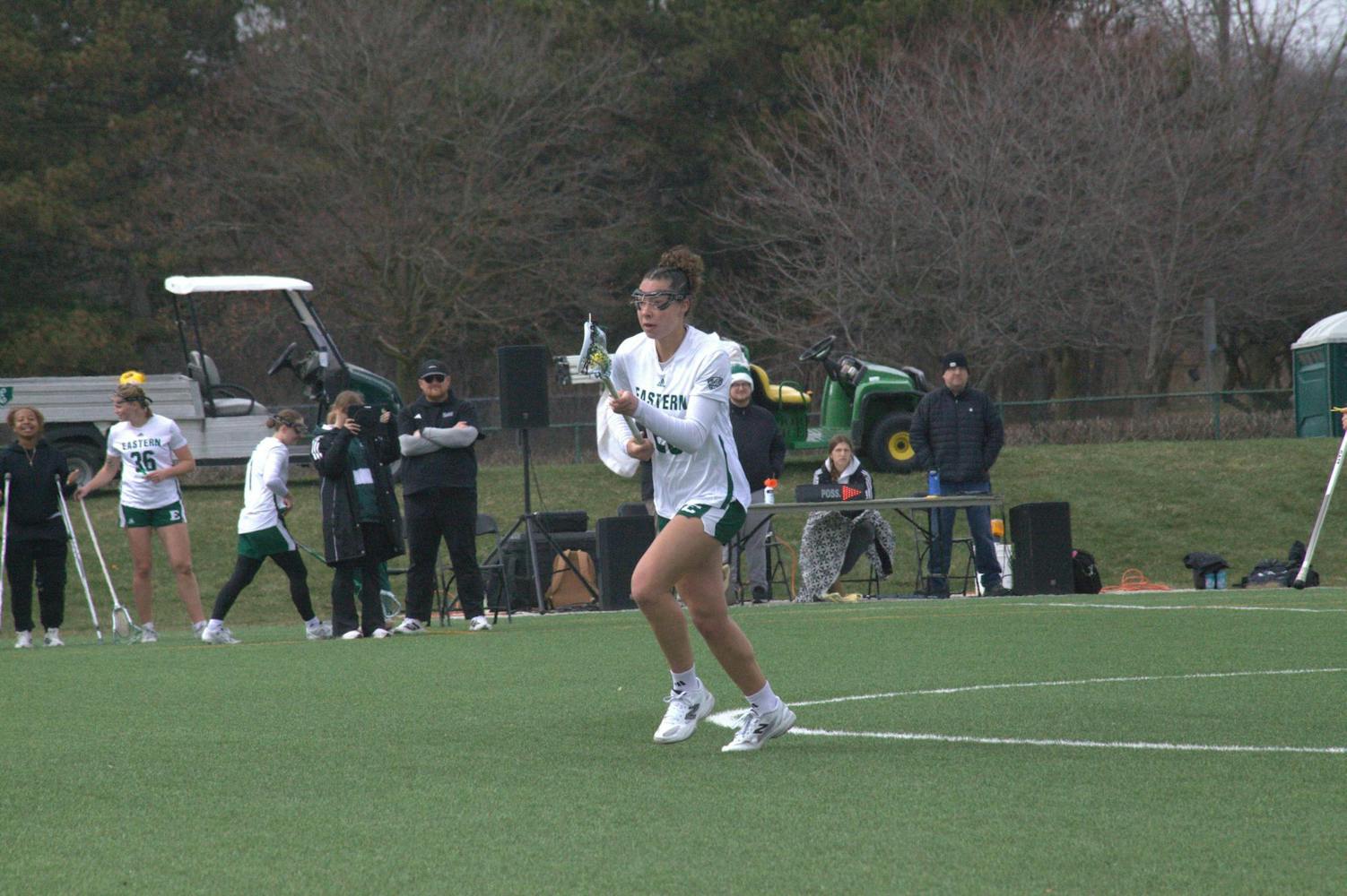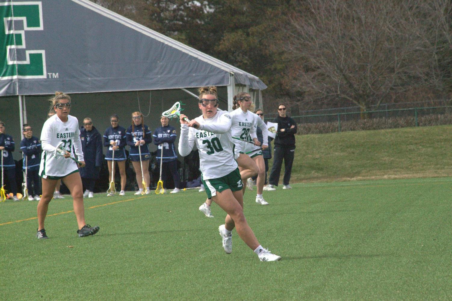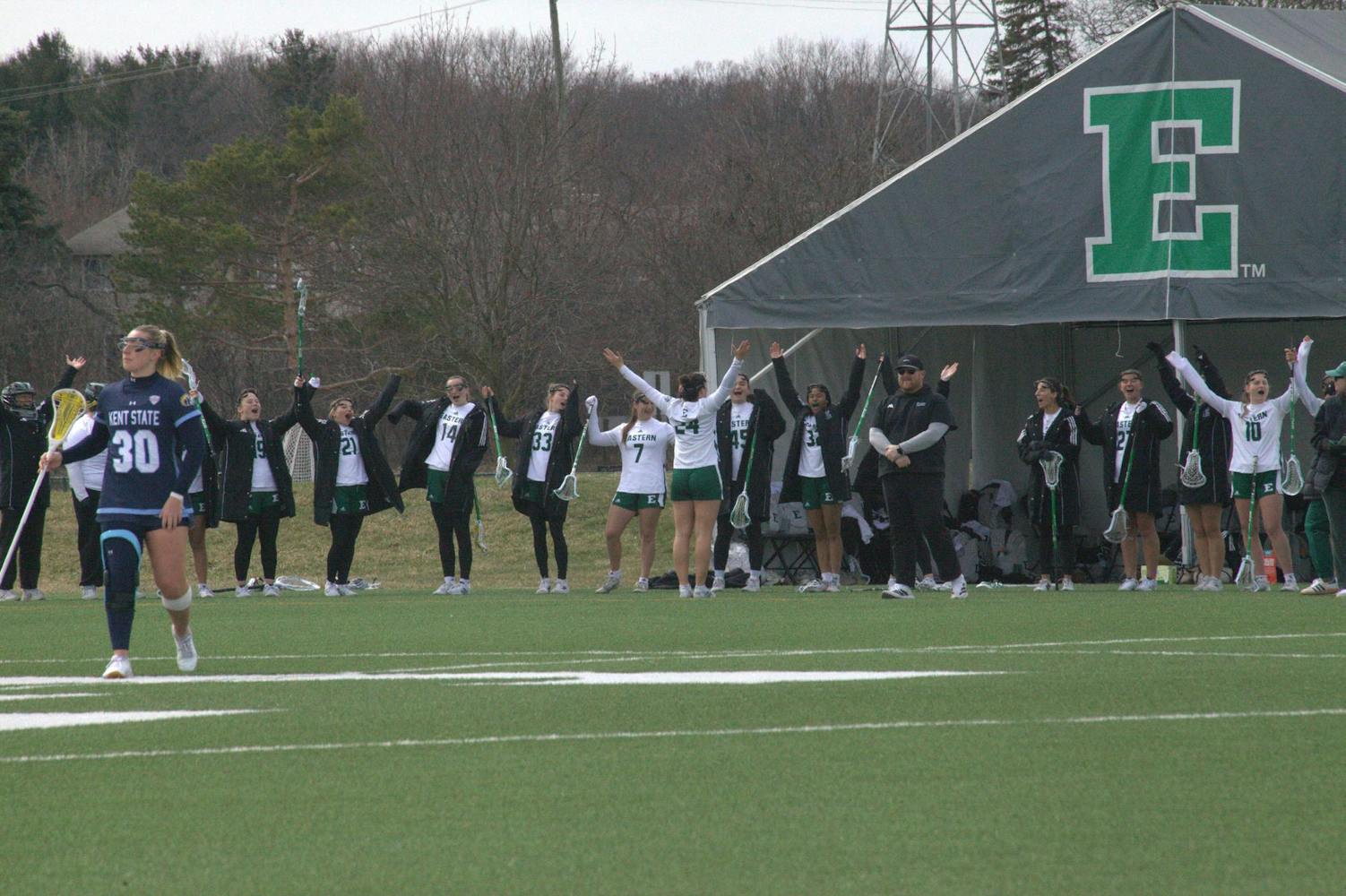 Eastern Michigan University's women's lacrosse team won 12-6 against Kent State University at Scicluna field on March 14, 2026. The game honored the legacy of Morgan Rodgers who lost her life to suicide in July of 2014 a couple of years after a season-ending knee injury. The game was dedicated to her and to eliminating the stigma surrounding mental health, empowering athletes on and off the field, and to promoting the message that mental health is just as important as physical health. (Gallery by Maddy Makin)