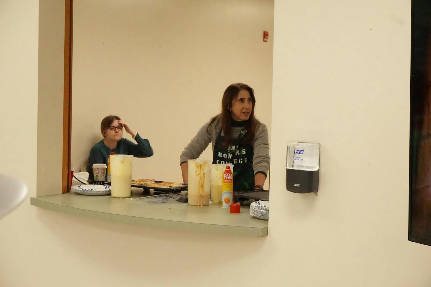 EMU honors students and faculty ran the Honors College Pancake Breakfast together in room 107 at the Honors College on Friday, Jan. 16, 2026. The breakfast included a variety of pancakes, such as cinnamon apple, blueberry, chocolate chip and plain in addition to toppings of butter, syrup and even whipped cream. The Honors College hosts a pancake breakfast once every month, so there will be many more opportunities for free pancakes in the future. (Gallery by Owen Cardenas)