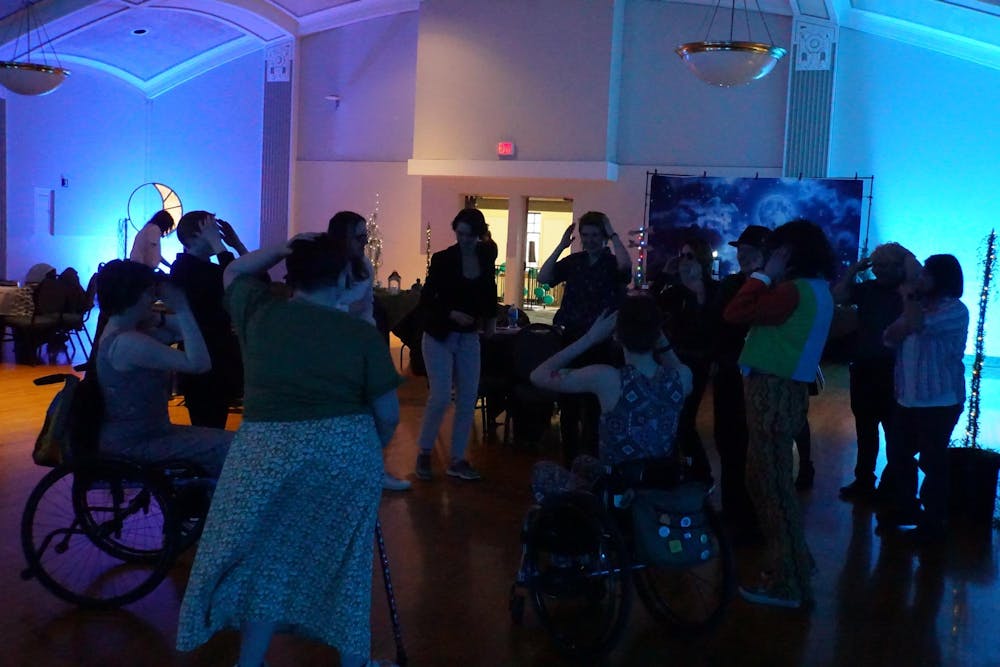 Pride Prom Macarena A group of students form a dance circle for the Macarena together at Pride Prom in the McKenny Ballroom on Thursday, March 12, 2026.