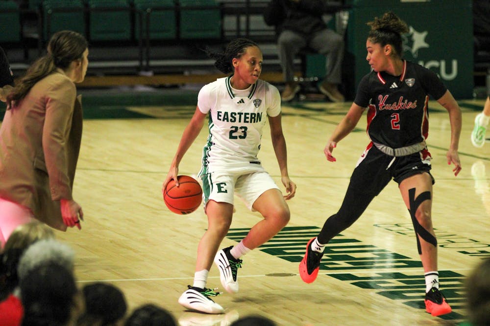 #23 Hill of Eastern Michigan University women's basketball team, dribbling the ball down the court with pressure from the Northern Illinois player, #2 Nadechka Laccen, in their game on Jan. 24, 2026 at the George Gervin GameAbove Center.