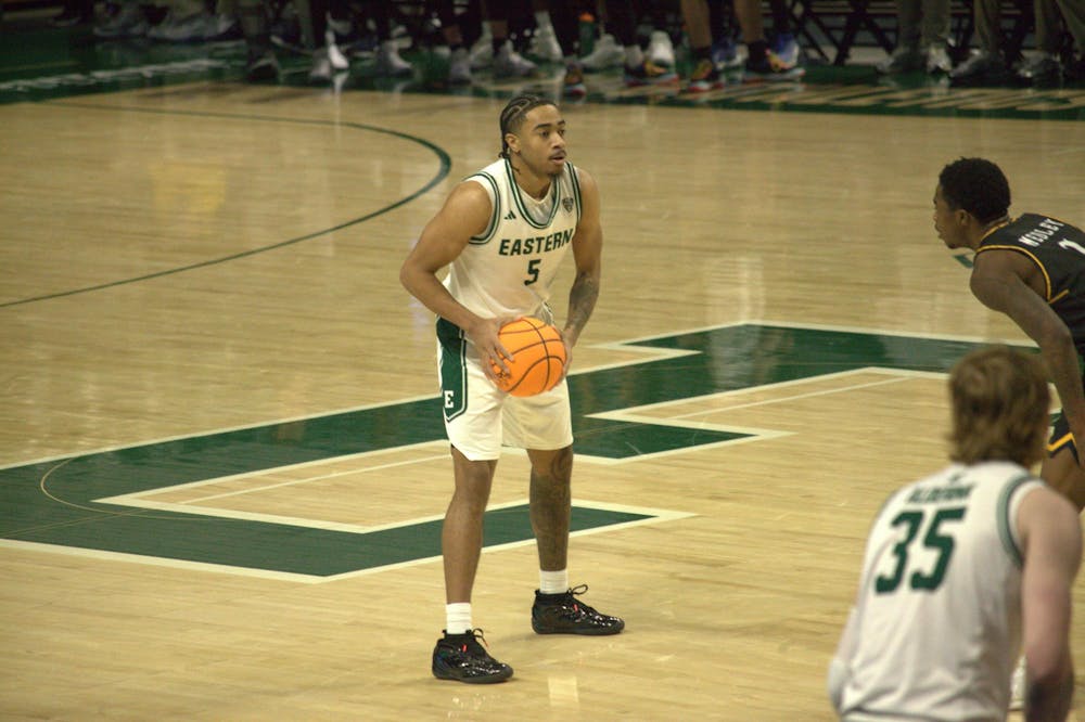 #5 Braelon Green waiting to pass the ball at the Jan. 24, 2026, Eastern Michigan University men's basketball game against Kent State at the George Gervin GameAbove Center.