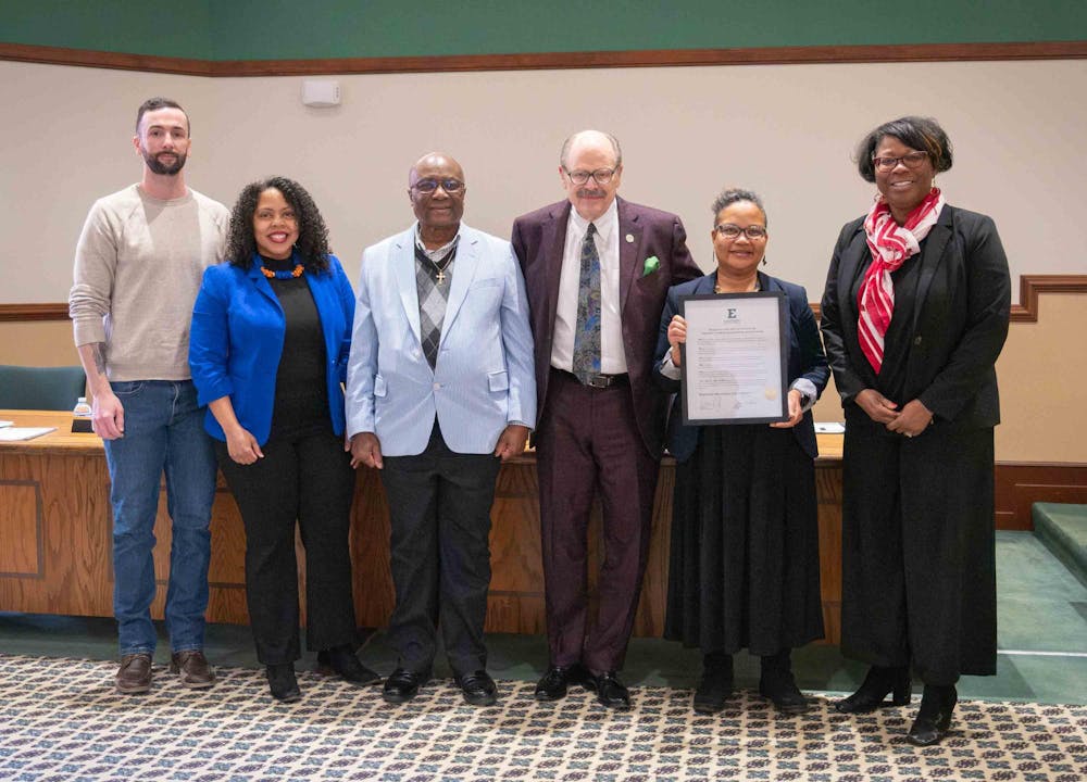 Members of the Africology and African American Studies program at Eastern Michigan University stand next to EMU President James Smith and Regent Jessie K.W. Kimbrough after receiving an award in recognition of the 50th anniversary of the program.