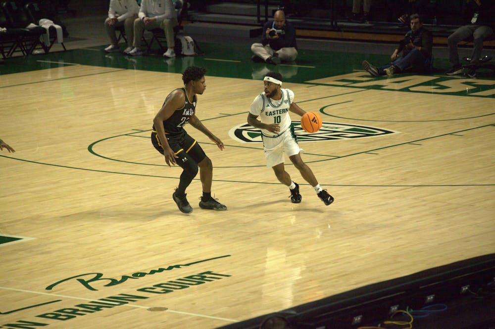 #10 Jon Sanders II dodges a Kent State player at Eastern Michigan University's Jan. 24, 2026, men's basketball game against Kent State at the George Gervin GameAbove Center.