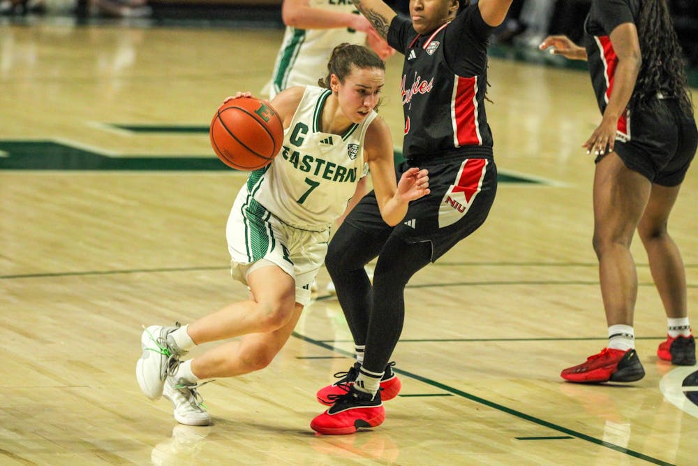 Eastern Michigan University women's basketball player, #7 Cea, driving the ball into the offensive zone during the game against Northern Illinois University on Jan. 24, 2026 at the George Gervin GameAbove Center.