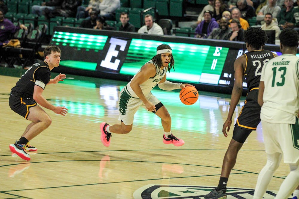 Eastern Michigan University men's basketball player, #3 Ellison, finding an open lane to bring the ball down in the game against Kent State on Jan. 24, 2026, at the George Gervin GameAbove Center.