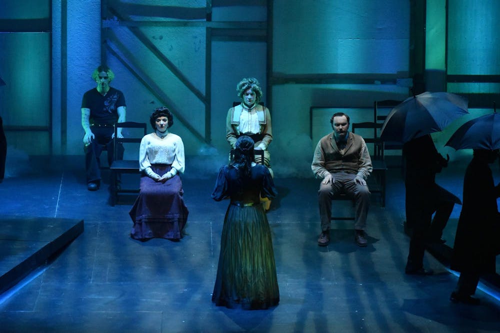 Our Town graveyard A deceased Emily Webb (Morgan Stillson) prepares to join the dead in the graveyard at her funeral in Eastern Michigan University Theatre's production of "Our Town" in Judy Sturgis Hill's Legacy Theatre.