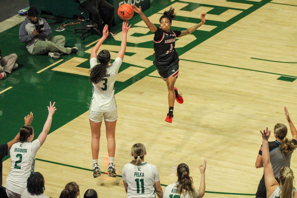 Eastern Michigan University women's basketball player, No. 3 Brooklyn Thrash, shoots a three-point shot during the game against Arkansas State on Feb. 7, 2026, at the George Gervin GameAbove Center.