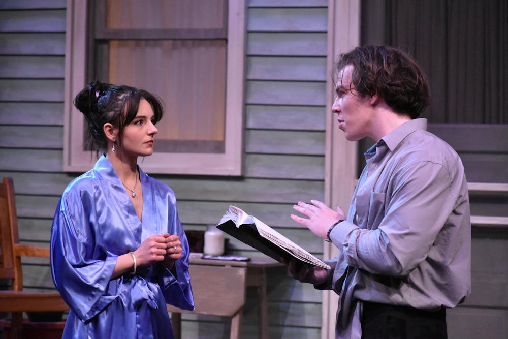 Catherine (Frankie Cramer) listens to Hal (Wyatt Hicks) as he excitedly discusses the findings from the notebook in her father's desk in EMU Theatre's production of "Proof" in Judy Sturgis Hill's Sponberg theatre.