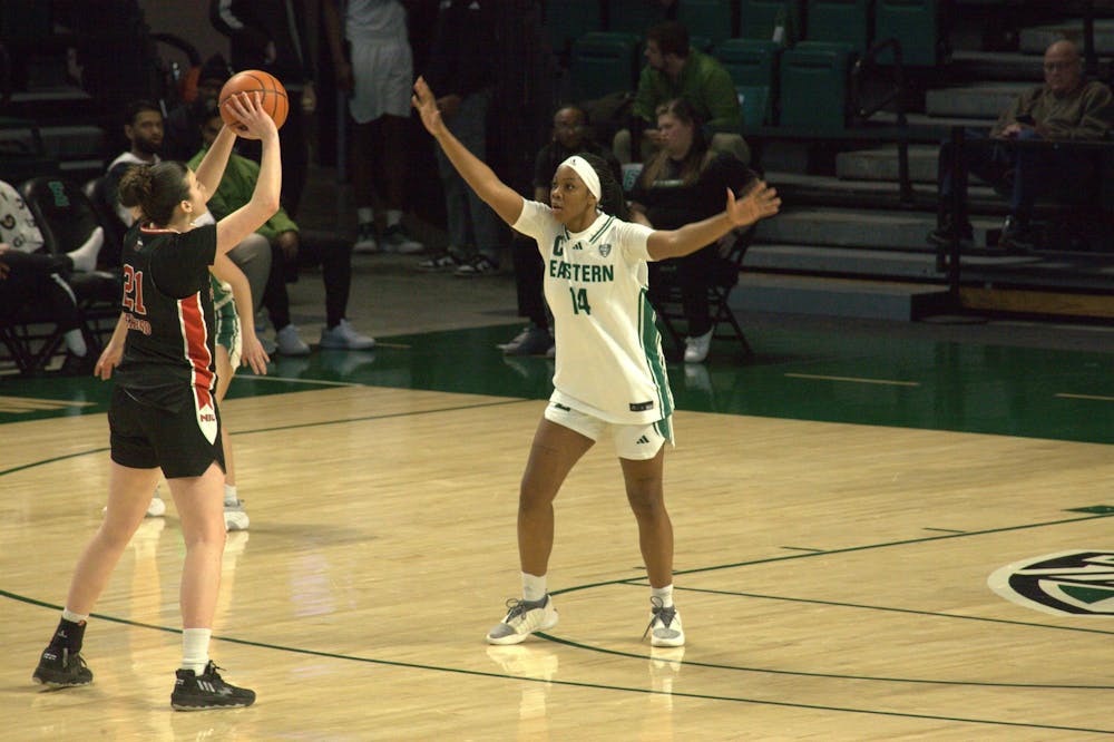 #14 Sisi Eleko attempts to block the basketball at Eastern Michigan University's women's basketball game against Northern Illinois University on Jan. 24, 2026 at the George Gervin GameAbove Center.