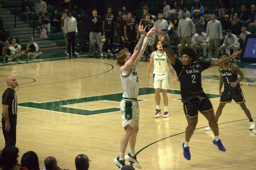 #35 Merritt Alderink shoots the basketball at Eastern Michigan University's game against Kent State at the George Gervin GameAbove Center on Jan. 24, 2026.