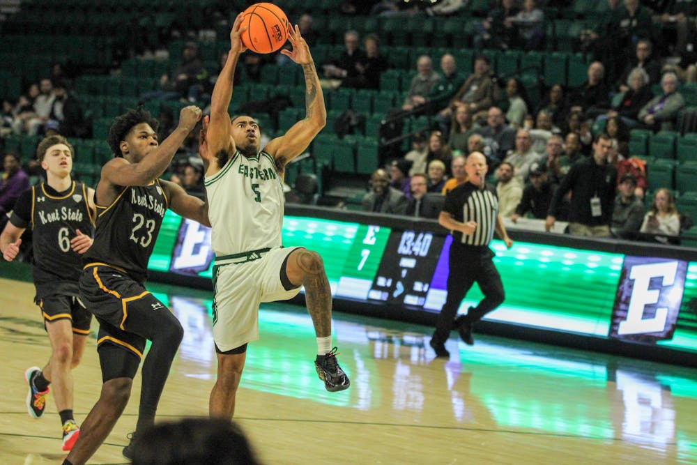 Eastern Michigan University men's basketball player #5, Braelon Green, in the process of completing a lay-up in the game against Kent State on Jan. 24, 2026, at the George Gervin GameAbove Center.
