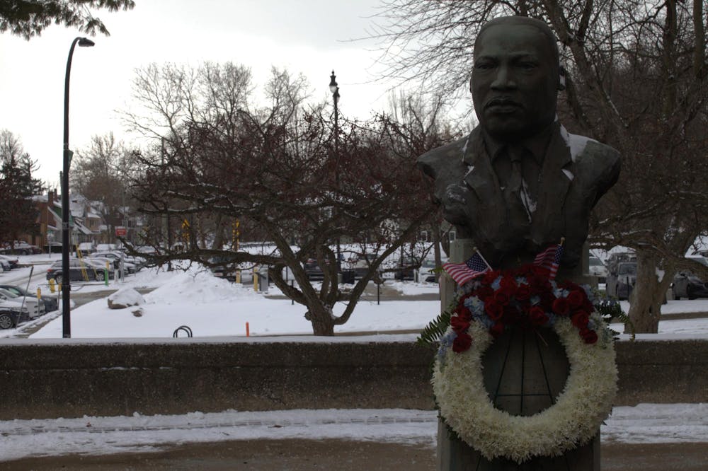 A statue of Dr. Martin Luther King Jr. adorned with a ceremonial wreath placed by students after Eastern Michigan University's MLK Ceremonial Wreath Laying and March to Freedom on Monday, Jan. 19, 2026.