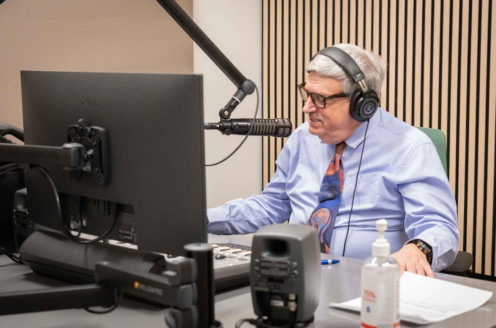 Kevin Meerschaert WEMU Reporter Kevin Meerschaert shows guests the brand new and modern equipment that he will be operating at the new WEMU station in Halle Library.