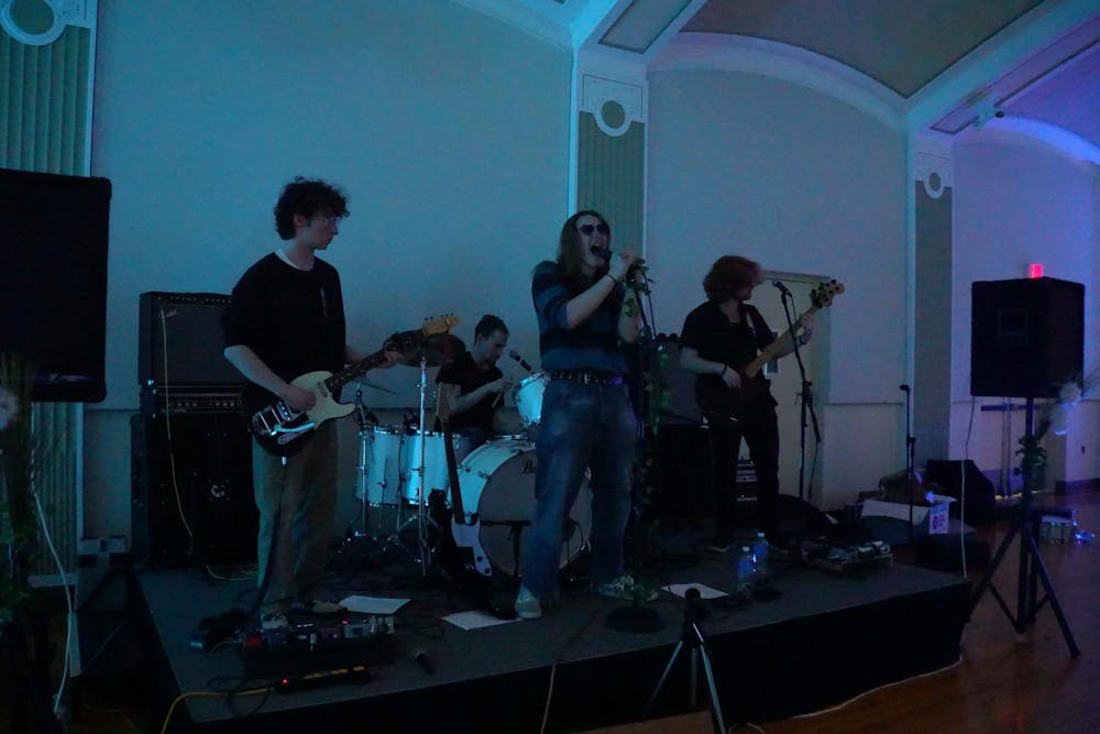 Exit Ticket performs The lead singer from Exit Ticket belts into the microphone at Pride Prom in the McKenny Ballroom on Thursday, March 12, 2026.