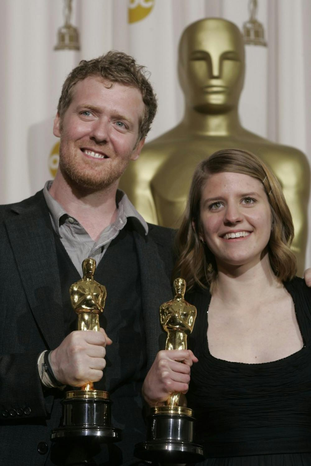 Glen Hansard and Marketa Irglova pose with their Oscars for Best Original song for "Falling Slowly" from the motion picture "Once" during the 80th Academy Awards at the Kodak Theatre in Hollywood, California, Sunday, February 24, 2008. (Daniel A. Anderson/Orange County Register/MCT)