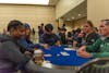 From left: Cynthia W., Lilith J. and Han J. participate in a game of Texas Hold 'em, dealt by both Grace R. and Matthew C. at Kings Casino in the Eastern Michigan University Student Center on March 11, 2026.