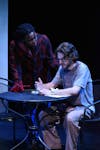Catherine (Frankie Cramer) listens to Hal (Wyatt Hicks) as he excitedly discusses the findings from the notebook in her father's desk in EMU Theatre's production of "Proof" in Judy Sturgis Hill's Sponberg theatre.
