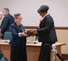 Eastern Michigan University Regent Jessie K.W. Kimbrough presents Toni Pressley-Sanon, interim department head and professor of Africology and African American Studies, with an award for recognizing the department's 50-year anniversary at the Feb. 12, 2026, Board of Regents meeting.
