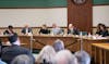 From left, Regents Jessie K.W. Kimbrough and Michael Hawks, Vice President and Secretary to the Board of Regents Vicki Reaume, Board Chairperson Nate Ford, President James Smith, and Regents Jenita Moore, and Anupam Chugh Sudhu at the Feb. 12, 2026, Board of Regents meeting in Welch Hall.