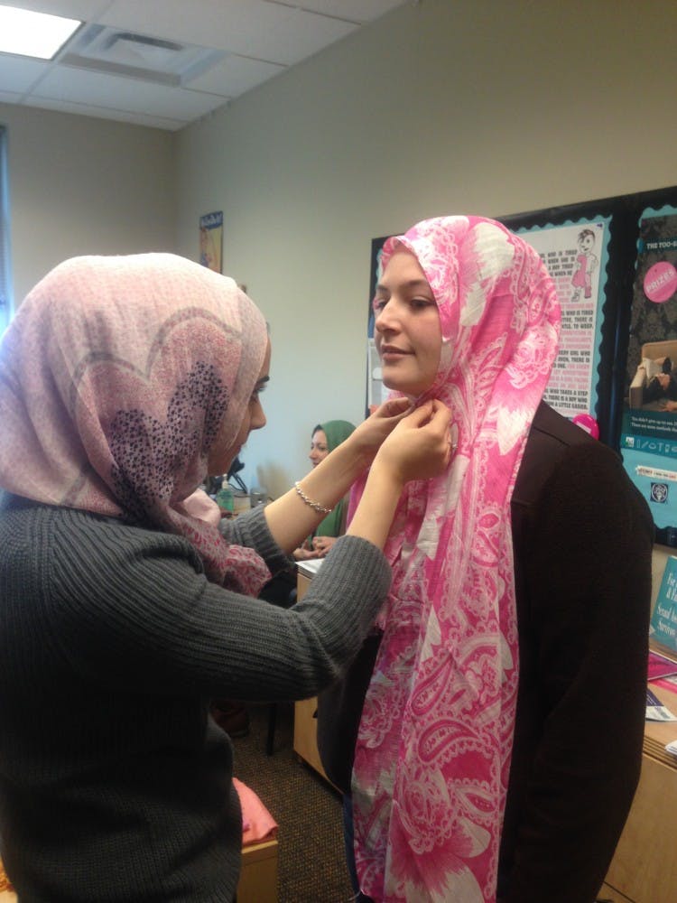 Volunteers from the Muslim Student Association spent time in the Women’s Resource Center on Wednesday fitting hijabs, or headscarves worn by female Muslims, on women who wanted to participate in the university’s Hijab Day.